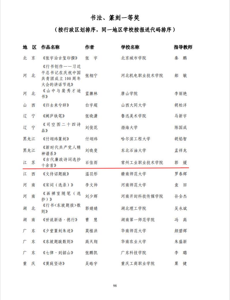 8月9日(rì),從(cóng)校團(tuán)委傳(chuán)來喜訊,在全國第七屆大學生藝術展演活動項目評選中,常州工業職業技術學院酒店(diàn)運營與管(guǎn)理專業石佳雨(yǔ)同(tóng)學創作的書法(fǎ)作品獲評藝術(shù)作(zuò)品類書法篆刻一等獎,成(chéng)為江蘇省在該類別唯一一項一等獎作品。旅遊與康養學院撰(zhuàn)寫的案例獲評美育改革創新案例二等獎,江蘇省僅有(yǒu)兩(liǎng)所(suǒ)高職院校獲獎(jiǎng)。