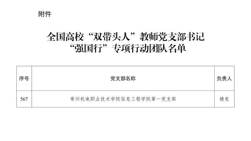 近日,教育部辦公廳公布了全國高校“雙帶頭人”教師黨支(zhī)部書記(jì)“強國行”專項行動團(tuán)隊名單,常州機電(diàn)職業技術學院信息工程學院第(dì)一黨(dǎng)支部書記樓競(jìng)團(tuán)隊入選。