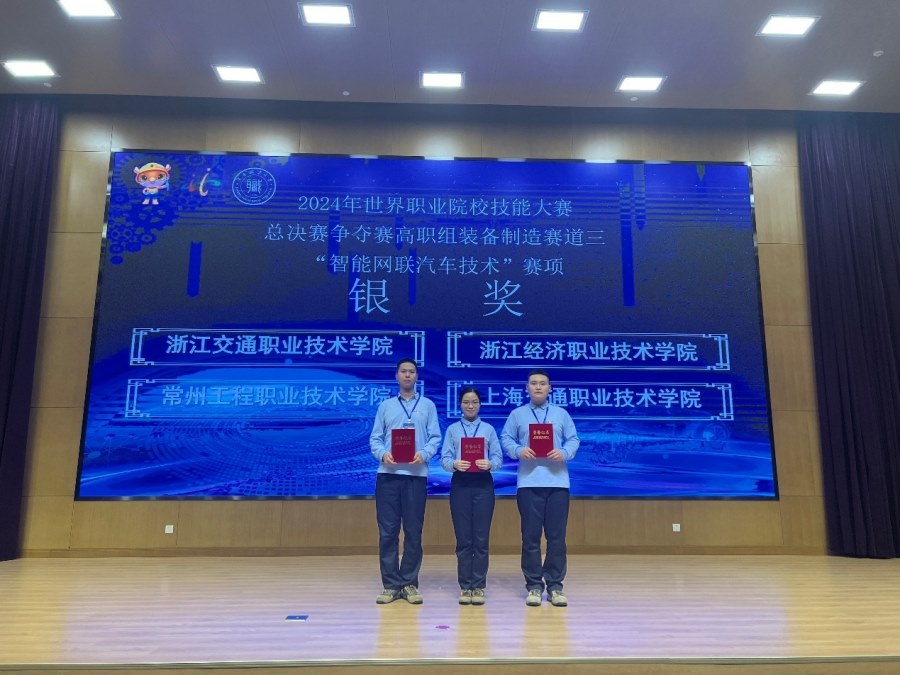 10月27日至31日,2024年世(shì)界職業院校技能大賽總決(jué)賽爭(zhēng)奪賽高職組(zǔ)裝備製造賽道三“智能網聯汽車(chē)技術(shù)”賽項(xiàng)在天(tiān)津職業大(dà)學(xué)落下(xià)帷(wéi)幕。來自全(quán)國各省、自治區、直轄市的59支(zhī)代表(biǎo)隊,200餘名選手同台競技。經過兩天的激烈比拚,常州工程職業技術學院(yuàn)智造學院王中磊、王莎老師指導的學生徐璟琦、潘耀東、楊紫(zǐ)荊團隊不畏強手、勇於拚搏,榮(róng)獲本賽項銀獎。