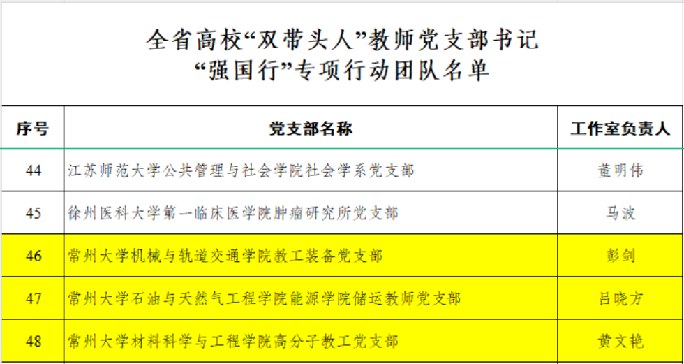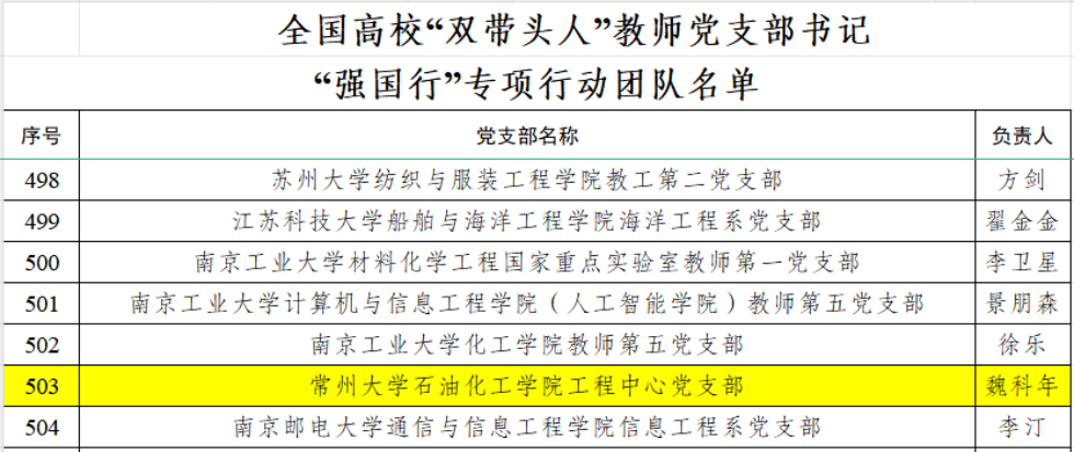 近日(rì),教育部辦公廳、省委教育工委分別公布了全國(guó)、全省高校“雙帶頭人”教師(shī)黨支部書記“強國行”專(zhuān)項(xiàng)行動團隊名單。常州大學石油化工學院工(gōng)程中心黨支部成功入(rù)選全國高校“雙帶頭人”教師黨支部書記“強國(guó)行”專項行動團隊;機械與軌道交(jiāo)通學院教工裝備黨支部,石油與天然氣工程(chéng)學院能源學(xué)院(yuàn)儲運教師黨支部和材料科學與工程學院高分子教工黨支部入選全省高校“雙帶頭人”教師黨支部書記“強國行”專項行動團(tuán)隊。