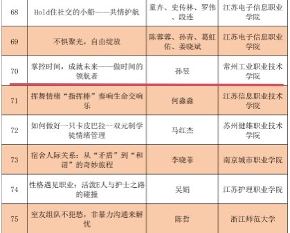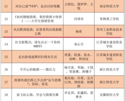 11月14日,從學工處傳來喜訊,在近日揭曉的全(quán)國(guó)高等學校心理健康教育微課征集展示活動結果(guǒ)中,常州工業職業技術學院信(xìn)息(xī)工(gōng)程學院孫昱老師的微課作品《掌握時間,成就未來——做時間的領航者》、信息(xī)工(gōng)程學院朱(zhū)菁老師(shī)指導學生楊(yáng)奕的作品《從沉默到綻放:社恐者的自我救贖(shú)之路》均成功入選。
