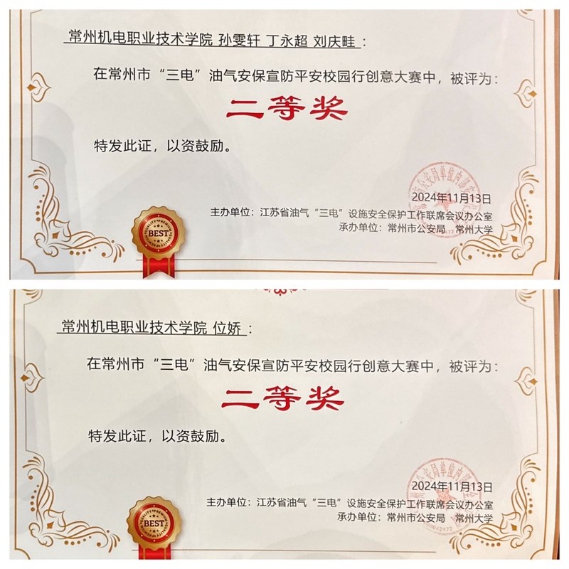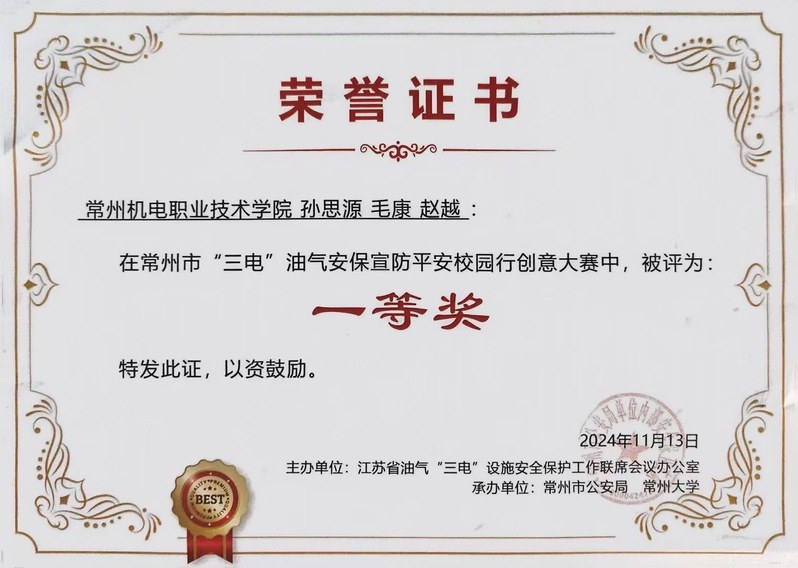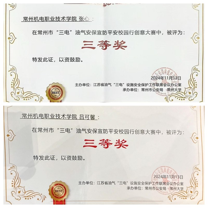 11月13日,常州市“三電”油氣安保宣防平(píng)安校園行創意大賽頒(bān)獎(jiǎng)儀式(shì)在常州大學舉辦。常州機電職業技術學院創(chuàng)意設計學院學生孫思源、毛康、趙越的創意視頻《守護(hù)“三電”與油氣設施,共築和諧社會》獲一等獎,創意設計學院學生位嬌、孫(sūn)雯軒(xuān)、丁永超、劉慶畦、呂可馨和交通工程學院學生張心的創意視頻《守護“三電”與油氣設施,共築和諧社會》、創意設計《熊貓三電護衛隊》《三(sān)電(diàn)油氣安全與你(nǐ)相通》《保三電油氣護(hù)油氣設施》分獲二、三等獎各2項。