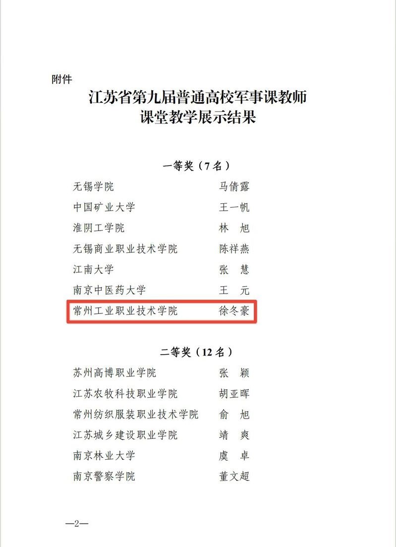 12月10日(rì),從學生工作部傳來喜訊,在近日由江蘇省(shěng)教育廳公布(bù)的江(jiāng)蘇省第九屆普通(tōng)高校軍事課教師課堂教學展示獲(huò)獎名單中,常州工業職業技術學院人民武裝部軍事課教師、機械與交通學院輔導員徐冬豪榮獲一等獎。