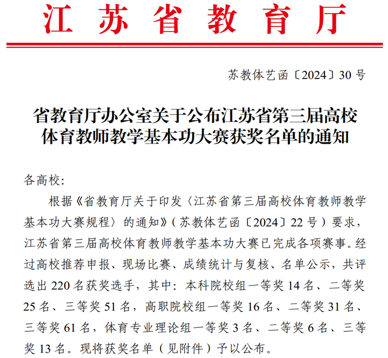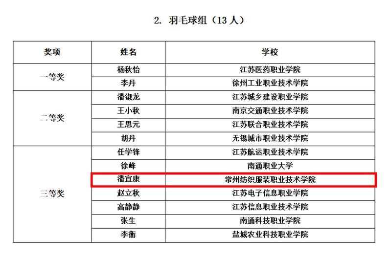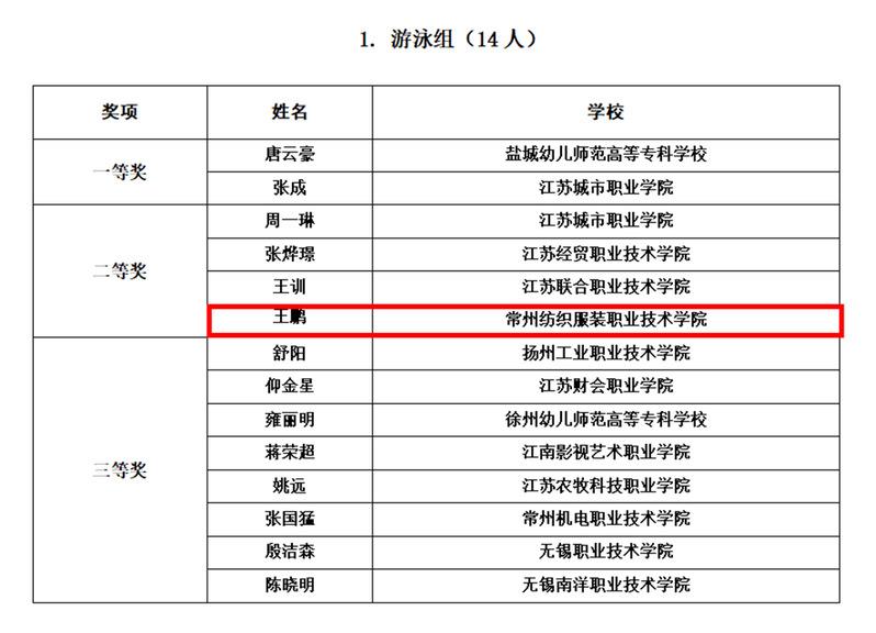 2024年11月22日至24日,由江蘇省教育廳主辦的第三屆高校體育教師基本功比賽在南京隆重舉行,常州紡織服裝職業技術學院體育部教師王鵬、潘宜(yí)康分別獲得(dé)遊泳組二等獎、羽(yǔ)毛球組三等獎(jiǎng)。