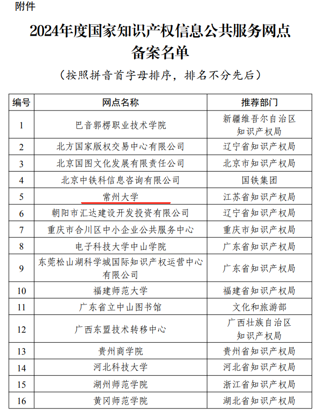 12月20日,國家知識(shí)產權局正式公布“2024年度國家知識產權信息公共服務網點名單”,常州(zhōu)大學經(jīng)江蘇省知識產權局推薦成功(gōng)入選(xuǎn),成為常州地區獲批的首家國家(jiā)知識產(chǎn)權信息公共服務網點(diǎn)。