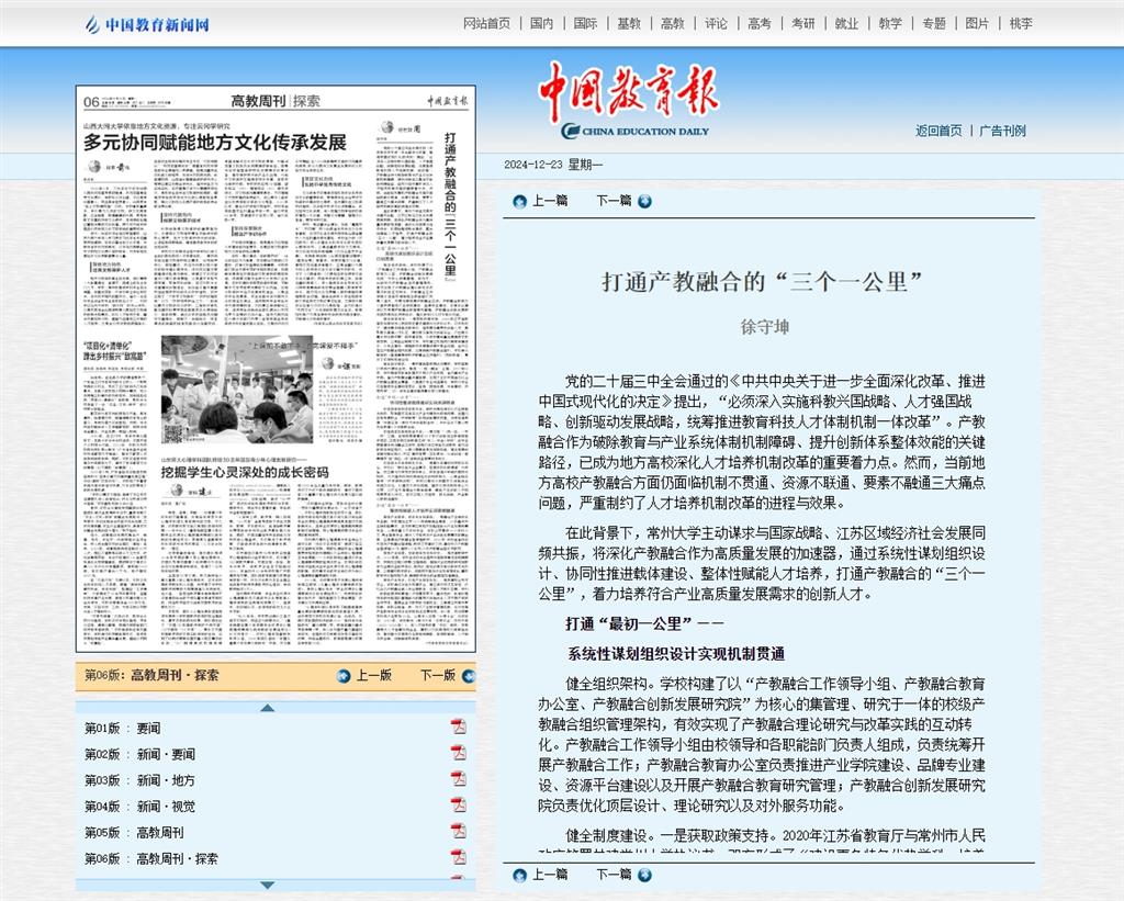 12月23日,《中國教育報》以“打通產教融合的(de)‘三個一公裏’”為題刊發我校黨委書記徐守坤署名文章。文章從“係統性謀劃組(zǔ)織設計實現機製貫通”“協同性(xìng)推進載體建設實(shí)現資源聯通”“整體性賦(fù)能人才培養實現要素融通”等方(fāng)麵闡述常州大學主動謀求與國家戰(zhàn)略(luè)、江蘇區域經濟(jì)社會發(fā)展同頻共振,將深化產教(jiāo)融(róng)合(hé)作為高質量發展的加速器(qì),打(dǎ)通產教融合的“三個(gè)一公裏”,著力培養符(fú)合產業高質(zhì)量發展需求的創新人才的特色舉措。具體內容如下: