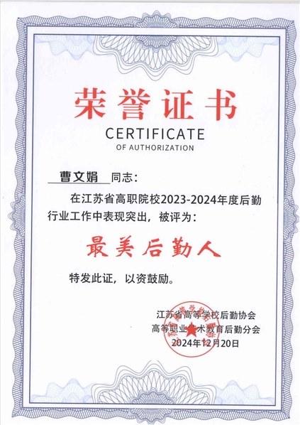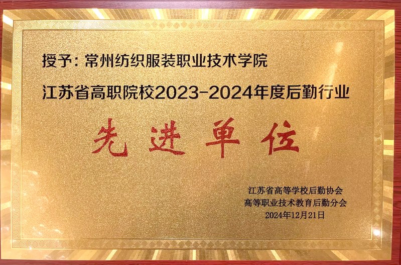 12月25日,高等職業技術教育後勤分會第二屆第三次會員大會暨後勤論壇在揚州成功舉辦,常州紡織服裝職業技術學院被評(píng)為“2023-2024年(nián)度江蘇省高職院校(xiào)後勤行業先進單位(wèi)”,曹文娟被評為“2023-2024年度(dù)最美後勤人”。