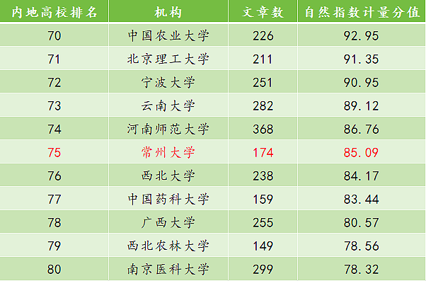 數據顯示,按照分數(shù)式計量數計算,我校在本期發布的總分值為85.09,在全球高校中(zhōng)排名第217位,在全國內地高校中排名第75位,在江蘇省內高校中(zhōng)排名第11位。在化學領域發表的原始創新研究論文共131篇,總分值(zhí)為71.18,占學校全學科總分(fèn)值的83.65%,在全球高校中排(pái)名第86位,在(zài)全國內地高校中排名(míng)第54位(wèi),在江蘇省內(nèi)高校中排名(míng)第7位。