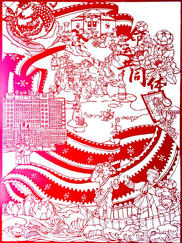 《悠悠運河情共(gòng)築同心夢》則采用國家級非物質文化遺產金壇刻紙的藝術形式,緊扣鑄牢中華(huá)民族共同體意識主題,巧妙地將(jiāng)常州地域(yù)文化符號與(yǔ)多民族元素相融合,充分展現了中華(huá)文化的豐富多樣性和(hé)民族團結精神。