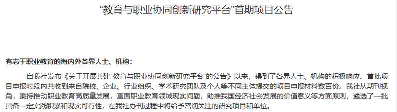 “教(jiāo)育與職業協同創新研究平台”旨在探索學(xué)術機構引領事業(yè)發展的工作(zuò)方(fāng)法,以“平台+主體”協同共建的方式創新有組織科(kē)研模式,踐行“實實在在把職業教育搞好(hǎo)”“把論文寫在祖國的大地(dì)上”等新時(shí)代職教發展精神,發揮(huī)學術期刊引(yǐn)領作用,推動職(zhí)業教(jiāo)育學術研究更好、更加全麵地服務經濟(jì)社會(huì)發展。