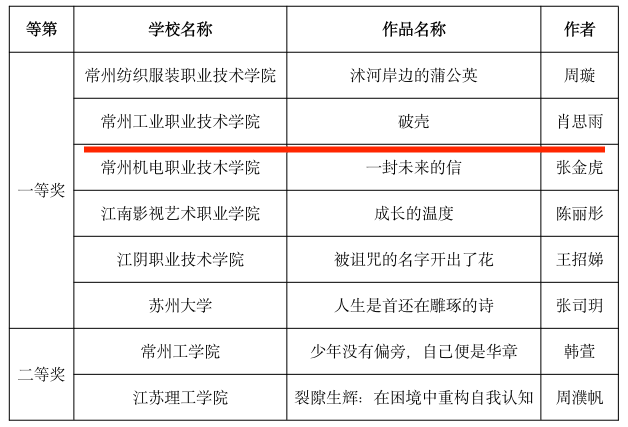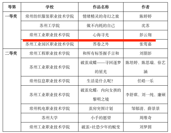 6月11日,從學工處傳來喜訊,在蘇南地區大學生心理健康教育研究中心近期主辦的係列活動中,常州工業職(zhí)業技術學院學生作品榮獲一等獎2項、二等獎3項、三等獎1項,6位(wèi)教師榮獲“優秀指導老師”稱號,學校在2個項目中榮獲“優秀組織獎”。