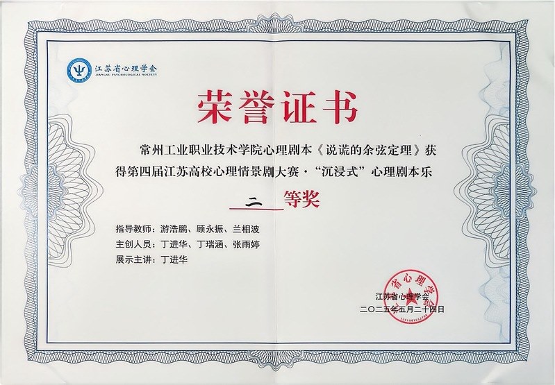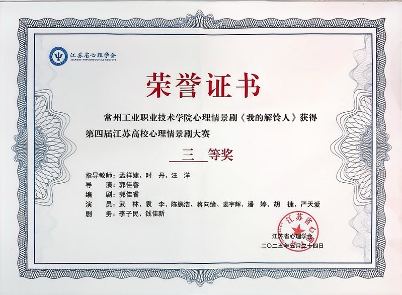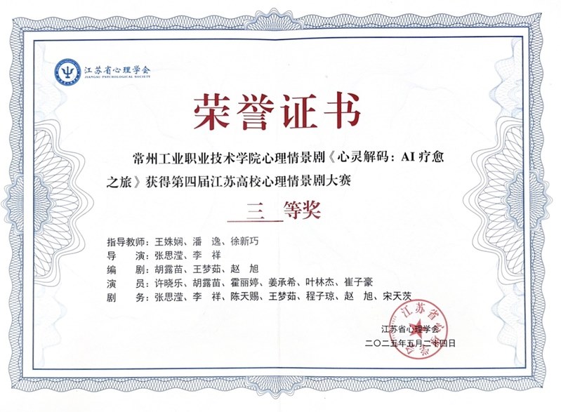 近日,由江蘇省心(xīn)理學會藝術心理(lǐ)輔導員與(yǔ)治療專業(yè)委員(yuán)會主辦的(de)第二屆江蘇省高校心理情景劇大賽決賽在鹽城師範學(xué)院(yuàn)舉行。由常州工業職業技術學院推(tuī)薦的心理劇本《說(shuō)謊的餘弦定理》從(cóng)全省97個參(cān)賽作品中脫穎而出(chū),榮獲二等獎;同時,學校推薦的(de)心理情景劇作品《心靈解碼:AI療愈之旅》和(hé)《我的(de)解鈴人》也(yě)從全省140個參賽作品中脫穎而出,均榮獲三(sān)等獎。遊浩鵬、王姝嫻、孟(mèng)祥婕等9位老師被評為大賽優秀指導老師。