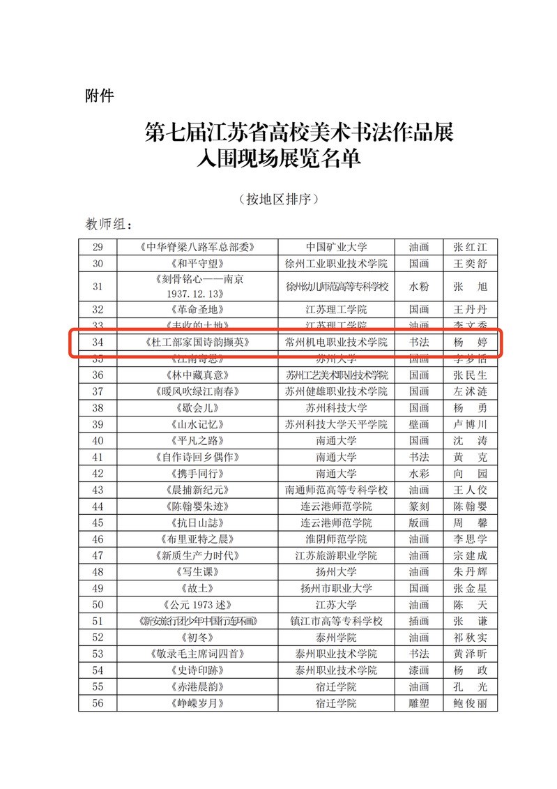 8月5日,江蘇省教育廳公布第七屆江蘇省高校美術書法作(zuò)品展入圍現場展(zhǎn)覽(lǎn)名單。常州機電職業技(jì)術學院校團(tuán)委教(jiāo)師楊婷的(de)書法作品入圍現場展覽環節。