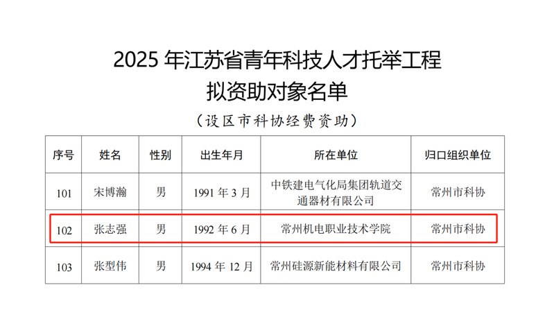 近日,2025年江蘇省青年科技人(rén)才托舉工程(chéng)資(zī)助對象評選推(tuī)薦結果公(gōng)布。經各省級學會、省部屬企事業(yè)單位、高校和設區市科協廣泛發動,多渠道申(shēn)報,專家評審,常州機電職業技術學(xué)院青年博(bó)士張誌強成功入選。