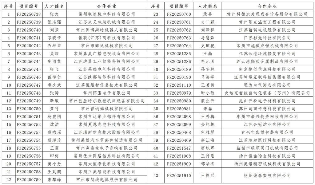 近(jìn)日,中共江蘇省委人才辦、江蘇省科學技術廳、江蘇省教育廳公布2025年度江蘇省科技副總立項名單,常州機電職業技(jì)術學院有43名教師被選聘(pìn)為“江蘇(sū)省科(kē)技副總”,創近年來學校該項目選聘數量新高(gāo),位列全省高職院校(xiào)首位。