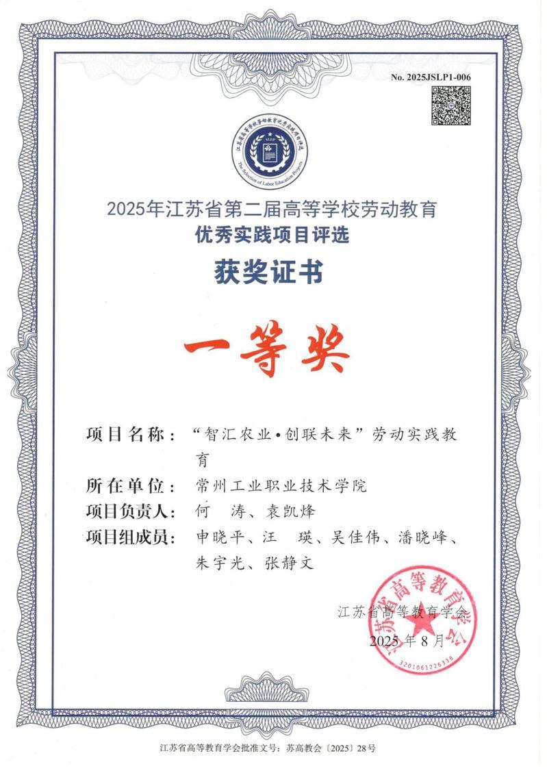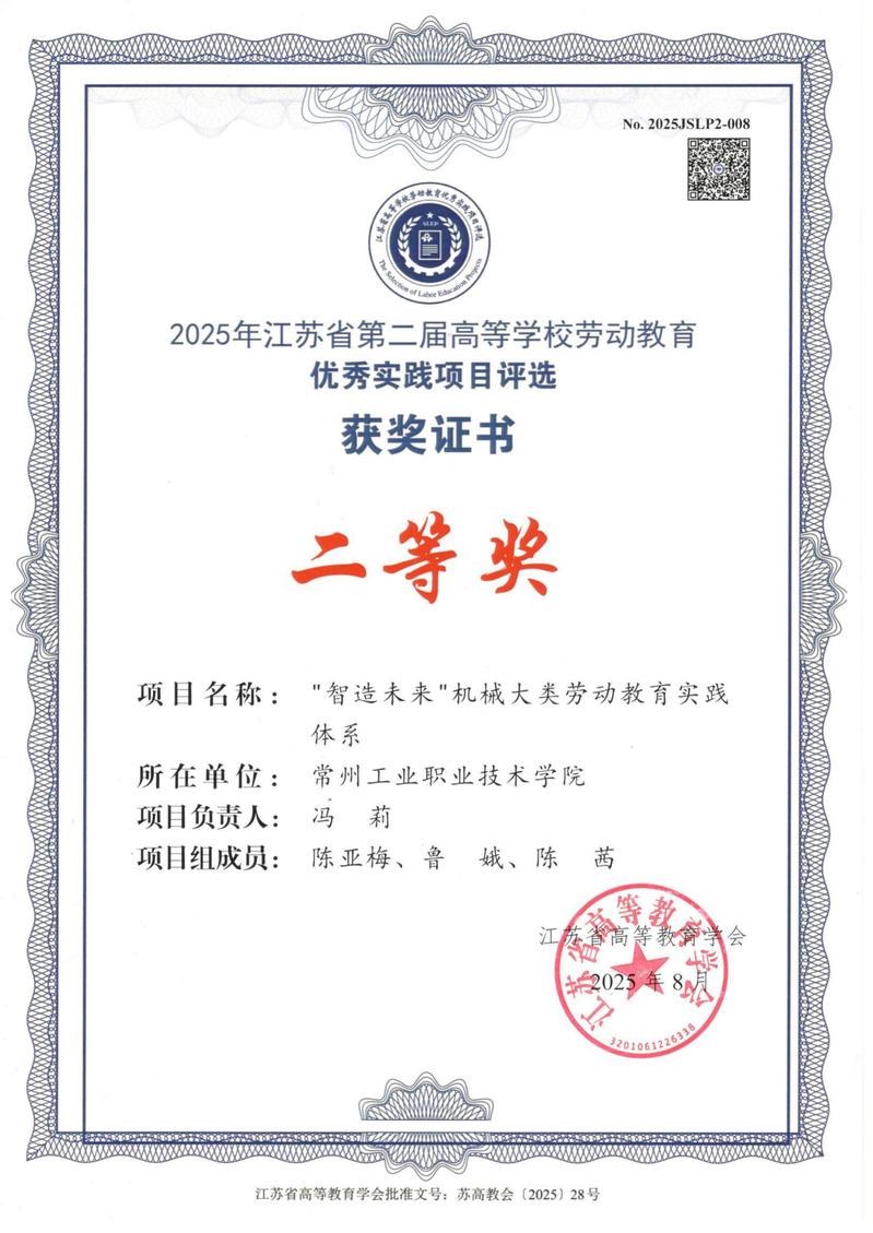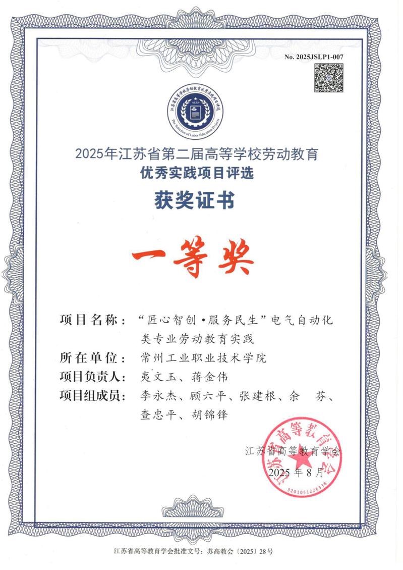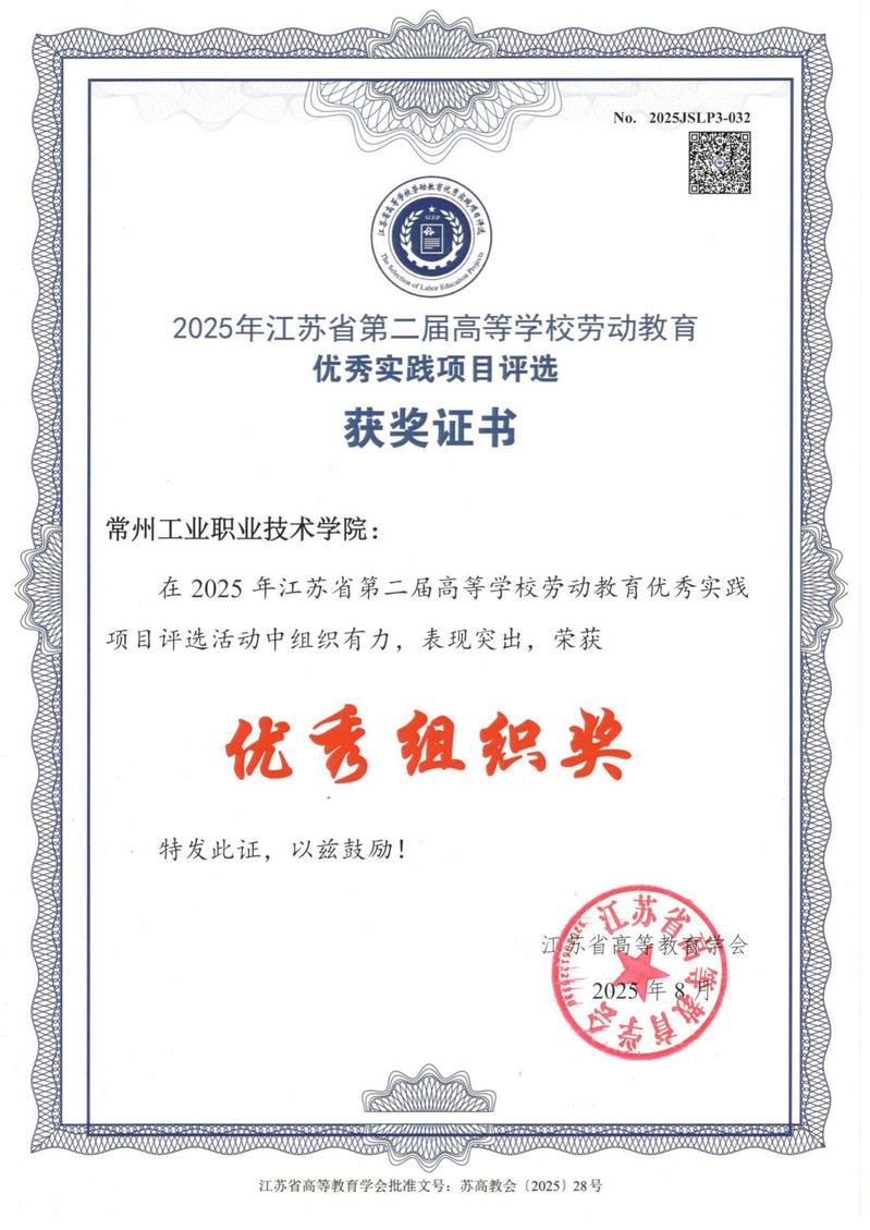 近日,江蘇省高等教育(yù)學會2025年高等學校(xiào)勞動教育優秀實(shí)踐項目評(píng)選結果出爐(lú),常州工業職業技(jì)術學院信息工程學院(yuàn)何濤、袁凱烽,智能控製學院夷文(wén)玉、蔣金偉的項目獲一等獎,機械與交通學院馮莉的項(xiàng)目獲二等獎。同時,學(xué)校榮獲江蘇(sū)省第二屆高等學校勞動教育優秀實踐(jiàn)項目評選活動(dòng)優秀組織獎。
