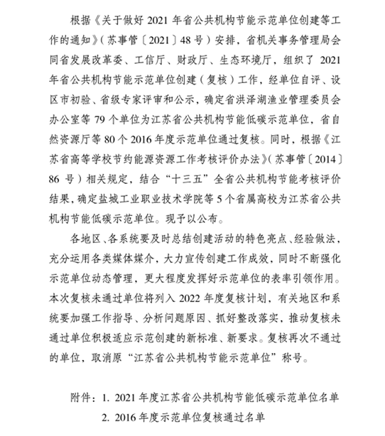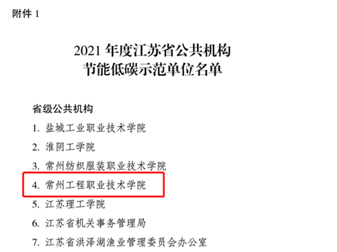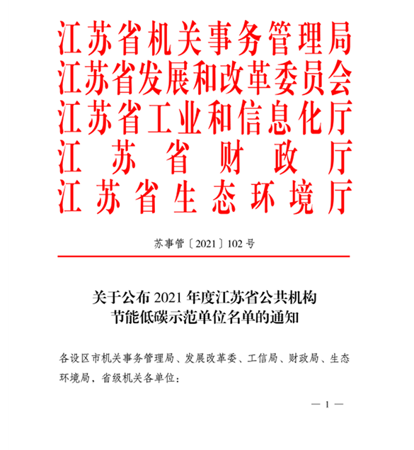 近日,根據《關(guān)於做好2021年省公(gōng)共機構(gòu)節能示範單位創建等(děng)工作的通知》(蘇事(shì)管(guǎn)〔2021〕48號)安排(pái),省機(jī)關事務管理局、發展和改革委員會、工(gōng)業和信息化廳、省(shěng)財政廳、省生態環境廳聯合組織了2021年省(shěng)公共機構節能(néng)示範單位創建(複核)工(gōng)作。按照《江蘇(sū)省(shěng)高等學校節約能源資源工作考核評價辦法》(蘇事管〔2014〕86號)相關規定,結合(hé)“十三五”全省(shěng)公共機構節能(néng)考核(hé)評價結果,我校被評為 “江蘇省公共機構節能低碳示範單位”,本次僅有五所省屬高校獲此榮譽。
