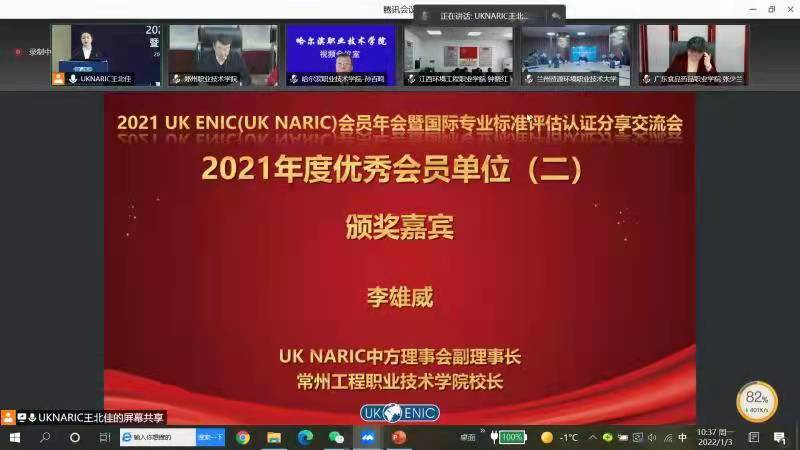 本次(cì)年會上,李雄威被聘為UK NARIC評估認證專家庫成員,並受邀作為頒獎嘉賓為優秀會員單(dān)位(wèi)頒獎。我校榮獲2021年度UK NARIC“優(yōu)秀會員單(dān)位”稱號,竇蘇明獲得“優秀個人獎(jiǎng)國教院