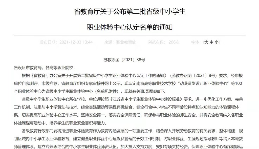 近期,江蘇省教育廳公布了第二批省中小學職(zhí)業(yè)體驗中心評審結果(guǒ)名單(dān),經自我申報、市級推薦,省教育廳組織專家審核,我校“非(fēi)遺技藝(yì)體驗(yàn)中心”被認定為省級(jí)中小學生職業體驗(yàn)中心。