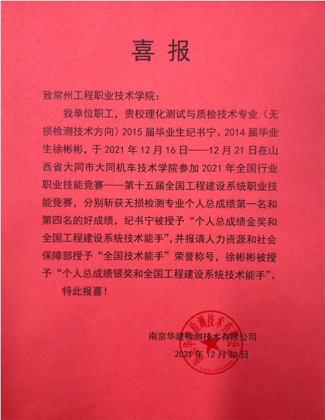近日,學校(xiào)優質合作企業南京華建檢測技術有限(xiàn)公司(sī)傳來(lái)喜訊,該公司職員、我校(xiào)智造學院理化測(cè)試與質檢技(jì)術專業(原無損檢(jiǎn)測技術)2015屆畢業生紀書寧、2014屆畢業生徐彬彬在“2021年全國行(háng)業職業技(jì)能競賽——第十五屆全國工程建設(shè)係統職業技能競賽“中斬獲一金(jīn)一銀的好成績,同時中建安裝在此次比賽中奪得無損檢測團(tuán)體第二名、焊接團體第三名的好成(chéng)績(jì)。賽事組(zǔ)委(wěi)會(huì)正報請人力資源和社會保障部對紀書寧授予“全國技術能手”榮譽(yù)稱號。