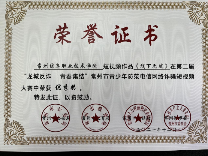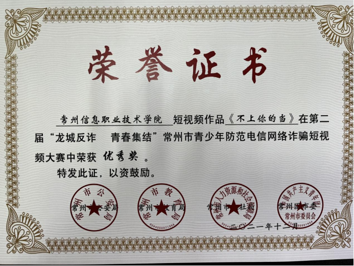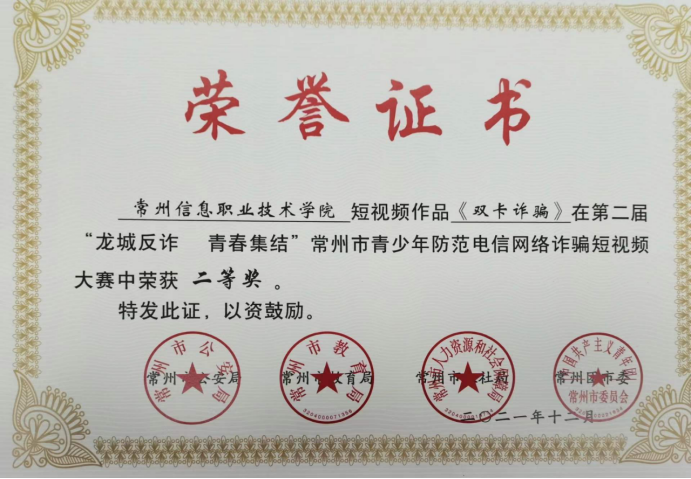 日前(qián),第二屆(jiè)“龍(lóng)城反詐,青春集結”常州市青少年防範電信網絡詐騙短視(shì)頻大賽頒獎暨“龍城校園(yuán)反詐聯盟”成立(lì)儀式在市公安(ān)局落下了帷幕。我校選送的8部短視頻作品在大賽中獲得優異成績,我校榮獲優秀組織獎。軟件與大數據學院(yuàn)分團(tuán)委選送的《雙卡詐騙》作品獲得大賽二等獎,電子工(gōng)程學(xué)院分(fèn)團委(wěi)選送的《不上你的(de)當》《線(xiàn)下無賊》以(yǐ)及數字經濟學院分團委選送的《欲貪其欲,必承(chéng)其險》3部作品獲(huò)得大賽優秀(xiù)獎。