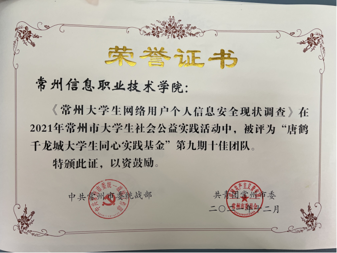 同時,我校“常(cháng)州大(dà)學生網絡用戶個人信息安全現狀調查”團隊獲評“十佳(jiā)團隊”,“‘青春向黨’,紅色科創行,暑期中學生夏令營”“‘振興之(zhī)星’,常信鄉村(cūn)影視助力團”獲評(píng)“優秀團隊”稱號。