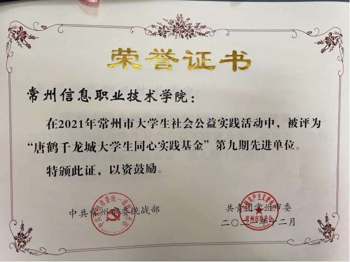 近日,中共常州市委統戰部、共青團常州市委發布《關(guān)於通報表揚(yáng)“永遠(yuǎn)跟黨走 奮進新時代”2021年常州市大學(xué)生社會公益實踐活動暨“唐鶴千龍城大(dà)學生同心實踐基金”第九期先進(jìn)單(dān)位、先進工作者、先進個人和先進團(tuán)隊的決定》,我校被評為“唐鶴千龍城(chéng)大學生同心實踐基金”第九期先進單位,陳(chén)潞等5名教師(shī)獲先進工作(zuò)者稱號、高尚(shàng)誌(zhì)等5名同學獲先進個人稱號。