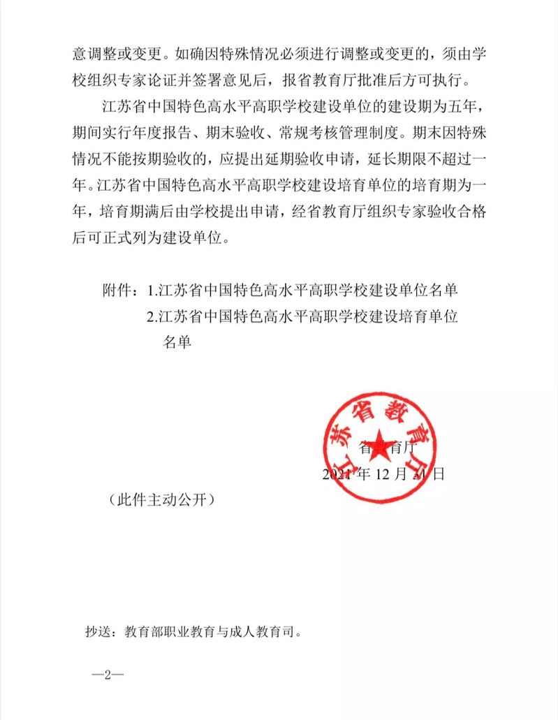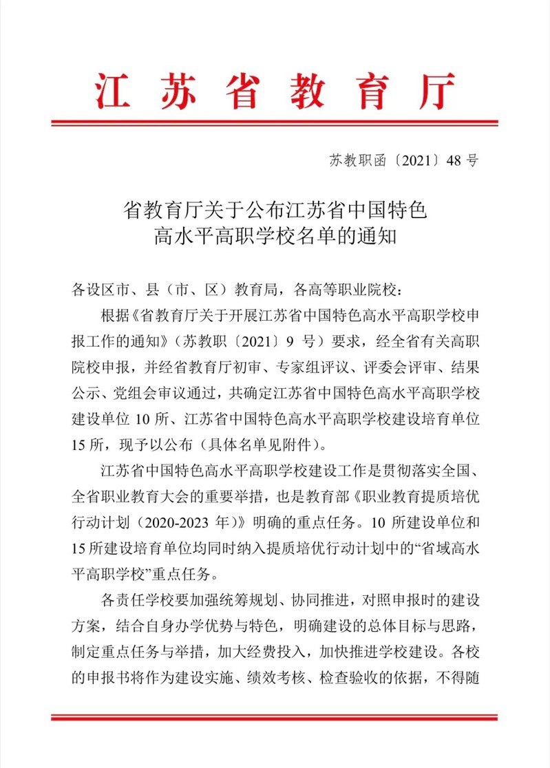 根據省教(jiāo)育廳文件(jiàn)《省教育廳關於公布(bù)江(jiāng)蘇省中國特色高(gāo)水平高職學校名單的通知》,我校成功(gōng)入選江蘇省中國特色高水平高職學校建(jiàn)設(shè)單位名單(dān)。這標誌著我校在“十四五”開局之年正式邁入省高水平高職(zhí)學校行列(liè),既是對學校綜合實力的極大肯定,也是對常工業人自強不息(xī)、砥礪前行(háng)奮鬥精神的極大鼓勵。學校事(shì)業發展將站在一個(gè)全新平台之上,美譽度(dù)和影(yǐng)響力上升到一個更高層次,對學校未來發展具有裏程碑意義(yì)和深遠曆史價值。