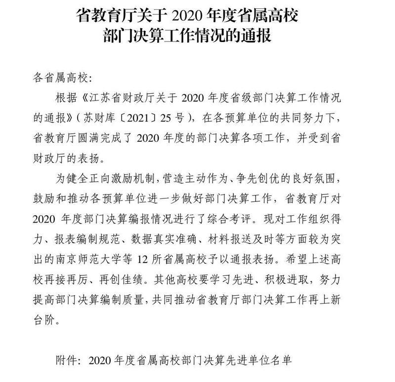 為健全正(zhèng)向激勵機製(zhì),營造主動作為、爭先創優的良好氛圍,鼓勵和推動各預算單(dān)位進一步做好部門決算工作,省教育廳對(duì)2020年度部門(mén)決算編報情況進行了綜(zōng)合評價,對南京醫科大學等(děng)12所省屬高校予以(yǐ)通報表揚。我校因決算工作組織得力(lì)、報表(biǎo)編製規範、數據真(zhēn)實準確等(děng)方麵表現突出,繼2017年和2019年,第三次獲得“省屬高校部門決算先進單位”榮譽(yù)稱號。學校財務處將以此為契機,進一步有效組織(zhī)收入,嚴格預算績(jì)效,提高服務(wù)水平,為學校各項事業發展提供(gòng)強有力的保障。
