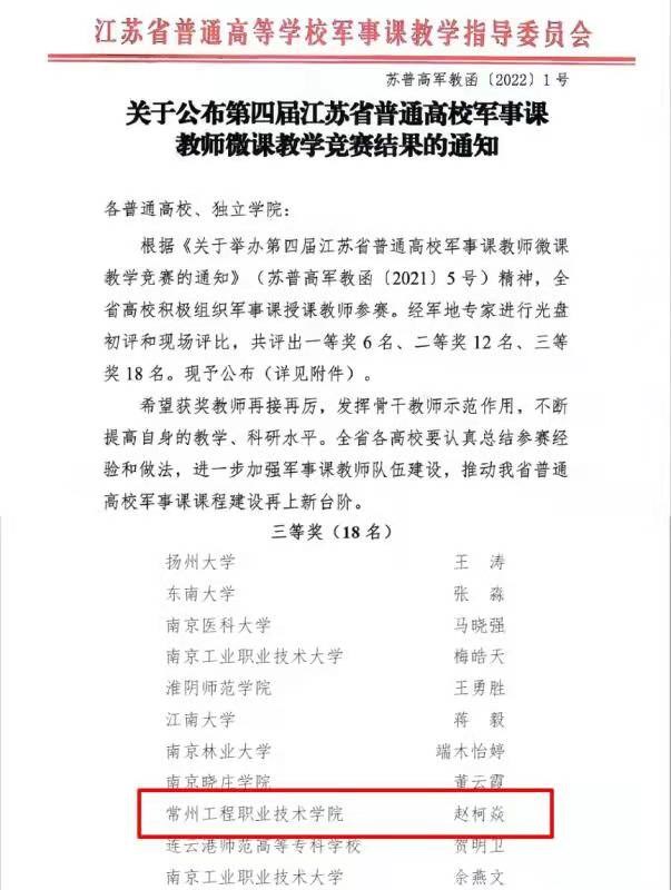 1月8日,由江蘇省普通高等學校軍事課教學指(zhǐ)導委(wěi)員會主辦的“第(dì)四屆江蘇省普通高校軍事課教師微課教學競賽決賽”在南京師範大學仙林校區國際(jì)學術交流中心(xīn)落下帷幕。常(cháng)州工程職業技術學院的(de)軍事教研室教師趙柯焱喜獲三等獎。