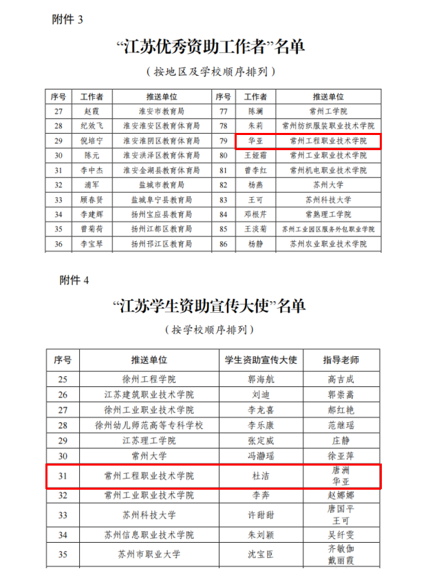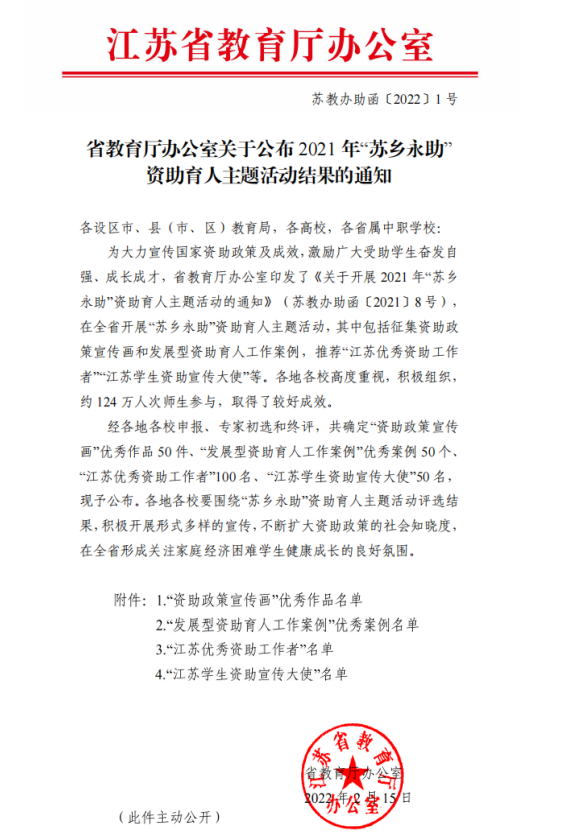 近日,江蘇省教育廳(tīng)辦公室(shì)印發《關於公布2021年“蘇鄉永助”資助育人主題(tí)活(huó)動結果的通知(zhī)》(蘇教辦助函〔2022〕1號)。常州工程職業技術學院的學工部華亞老(lǎo)師常年在資助一線勤懇耕耘(yún),熱心學(xué)生(shēng)資(zī)助事業,認真鑽研和創(chuàng)新學生資助工作,榮獲“江蘇優秀資(zī)助工作者”稱號。檢驗檢測認證學院學(xué)生杜潔(jié)在輔導員唐洲老師和(hé)學工部華亞老師的精心指導下,充分利用校內外各方力量,並結合實(shí)際,開展形式創新(xīn)、重點突出、反響較好的(de)資助政策(cè)宣傳活動,擴大了資助政策的知曉度,榮獲“江蘇學生資助宣(xuān)傳大使”稱號。