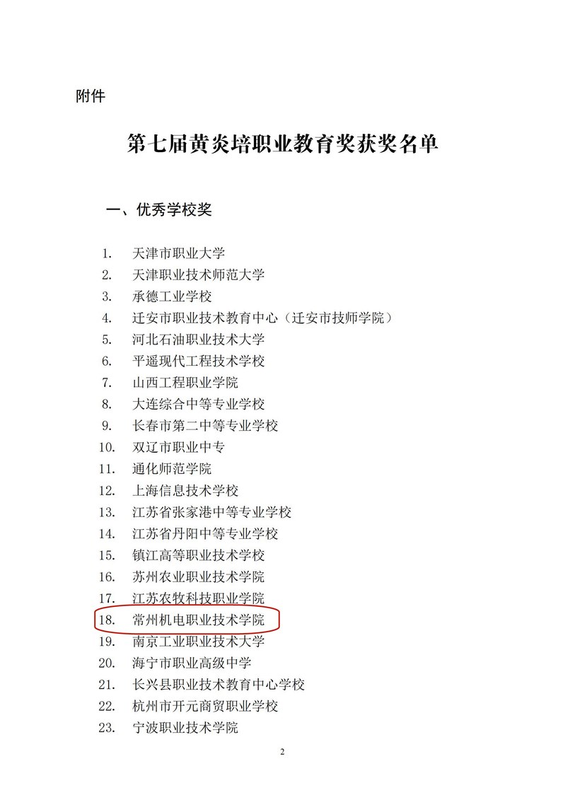 近日,全(quán)國第七屆(jiè)黃炎培職業教育獎獲獎名單公布,常(cháng)州機電職業技術學院榮獲“優秀(xiù)學校獎”。本屆(jiè)黃(huáng)炎培職業(yè)教育獎經(jīng)資料審核、網絡(luò)初(chū)審、複審、終審(shěn)、公示及異議處理等環節,評選出優秀學(xué)校獎55個。