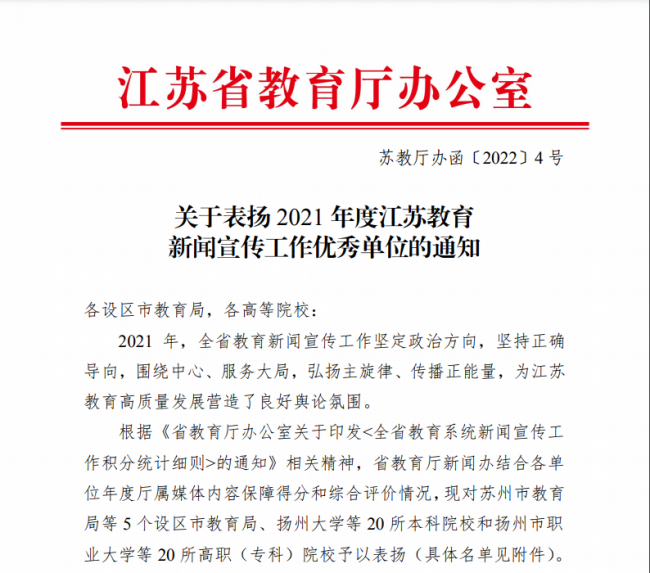 近日,江蘇省教育(yù)廳辦(bàn)公室發布《關(guān)於表揚2021年度江(jiāng)蘇教育新聞宣傳工(gōng)作優秀單位的通知》。省教育廳(tīng)新(xīn)聞辦結合各單位年度廳屬媒體內容保障得分和綜合(hé)評(píng)價情況,對5個設區市教育局(jú)、20所本科院校和20所高職(專科)院校予(yǔ)以表揚。常(cháng)州(zhōu)工程職業技術學(xué)院榜上(shàng)有(yǒu)名,被評為2021年度“江(jiāng)蘇教(jiāo)育新聞宣傳工(gōng)作優秀單(dān)位”,迄今為止,學校(xiào)已連續4年(nián)獲省教育廳表彰。