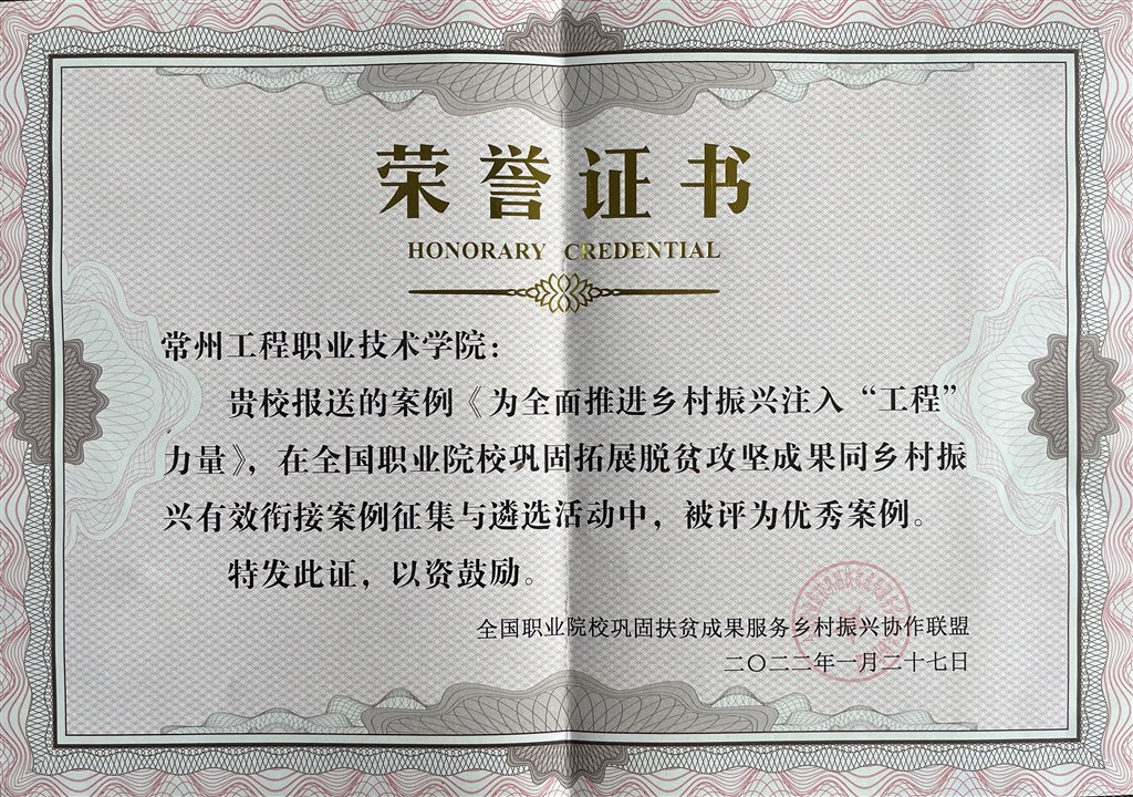近日,全國職業院校鞏固扶(fú)貧成果服務鄉村振興協作(zuò)聯盟(以下簡稱“聯盟(méng)”)發布《關於職業院校鞏固拓展脫貧攻堅成果同鄉村(cūn)振興有效銜接優秀案例遴選結果的(de)通報》。經聯盟組(zǔ)織專家從問(wèn)題的普遍性、模式舉措的可推(tuī)廣性、實踐成效、示範輻射等(děng)方麵對(duì)全國職業院校報送案例進行遴選,共評出40個優秀案例。常(cháng)州工程職業技術學院精心組織(zhī)、嚴格遴選的案例《為全麵推進鄉村振興注入“工程”力量》獲評優秀案例。