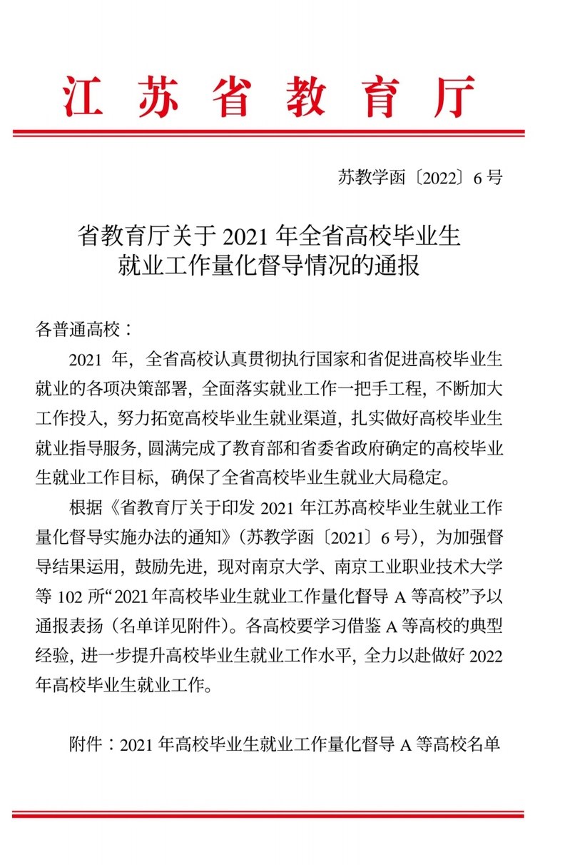 日前,江(jiāng)蘇省教育廳發布《省(shěng)教育廳關於2021年全省高校畢業生(shēng)就(jiù)業工作量化督導情況的通報》,對2021年高校畢業生就(jiù)業(yè)工作量化督導A等高校予以通報表揚。常州工業職業技術學院圓(yuán)滿完成既定工(gōng)作目(mù)標,再次榮獲就業工作量化(huà)考核A等次。