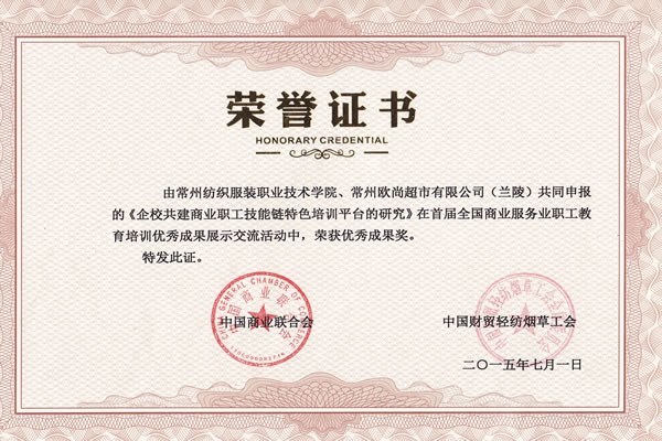 近期,由中國商業聯合會(huì)主辦的第十屆中國零售商大會“中國商業服務業職業教育發展論壇”在江蘇昆(kūn)山召開。論壇對外發布了“首屆全(quán)國商業服務業職(zhí)工教(jiāo)育培訓優秀成果”評選結果,我校經貿係教授(shòu)工作室團隊聯合常州歐尚超市有限公司(蘭陵)申報的“企校(xiào)共建商業職工技能鏈特色培訓平台的研究”榮獲優秀成果獎。