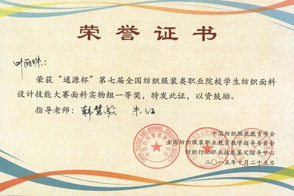 在大賽麵料實物組比賽中,我院紡(fǎng)化係(xì)葉麗珠同學榮獲一等獎並榮獲《技師》證書,朱淑芹獲二等(děng)獎,楊慧、王迪、許晴同學獲三(sān)等獎,韓慧敏、朱(zhū)紅獲“優秀指導老師”獎,常州紡織服裝職業技(jì)術學院獲得“團體二等獎(jiǎng)”。