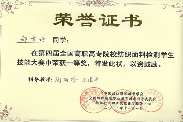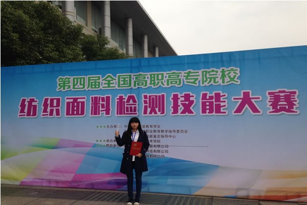 我院紡織品檢驗與貿易專業5名選手參加了比賽(sài),經過理論和(hé)操作的激烈(liè)角逐,我院榮獲得紡織麵料檢測學生技能(néng)大賽團體一等(děng)獎,紡檢1331班郤雪婷同學獲(huò)得大賽一(yī)等獎,李丹丹、孫榮珍、薑文豔同學(xué)獲得大賽二等獎,賈海蘭同學獲得大賽三等獎(jiǎng),其中郤雪婷同學因比賽成績優異獲(huò)得技師資格。本次大賽由陶麗(lì)珍、王建平、王明芳老師指導,陶麗珍、王建(jiàn)平老師獲(huò)得(dé)了“優秀指導老師”稱(chēng)號。