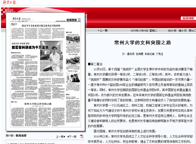 近五年來,常州大學相繼實現國家社科基金重大(dà)項目、國家社科基金重點(diǎn)項目(mù)、國家藝術(shù)基金項目、教(jiāo)育部委托項目和江蘇省社(shè)科基金重點項目(mù)零(líng)的突破(pò)。商學院史楊焱博士課題組的研究論文在國際頂級期刊International Journal of Production Economic(IJPE)上(shàng)發表。以該校學者(zhě)為主體(tǐ)編撰的常州(zhōu)文化研究的第一部區域(yù)斷代專史——《清代常州文化簡史》,得到了著名學者葛劍雄的認(rèn)可與讚賞。此(cǐ)外,《常見財產犯罪及防範》成為(wéi)該校第一門全麵完成並正式上線的“中國大(dà)學視頻公開課”;文科學生的1項成果獲第十四屆“挑戰杯”江蘇省大學生課外學術科(kē)技作品競賽(sài)特等獎。這些成果極大地提升了學校的知名度和美(měi)譽度。