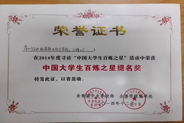 近日,從共青團中(zhōng)央學(xué)校部和全國(guó)學聯秘書處傳來喜訊,根據(jù) 《關於進一步推進大學生(shēng)“走下網絡、走出宿舍、走向操場”主題群眾性課(kè)外體育鍛煉活動工作的通知》文件精神,來自我院機電工程係的51棟307宿(xiǔ)舍全體(tǐ)成員在2014年度尋訪(fǎng)“中國大學生百煉之星(xīng)”活動中榮獲(huò)“中國大學生百煉之星”提(tí)名獎(jiǎng)。