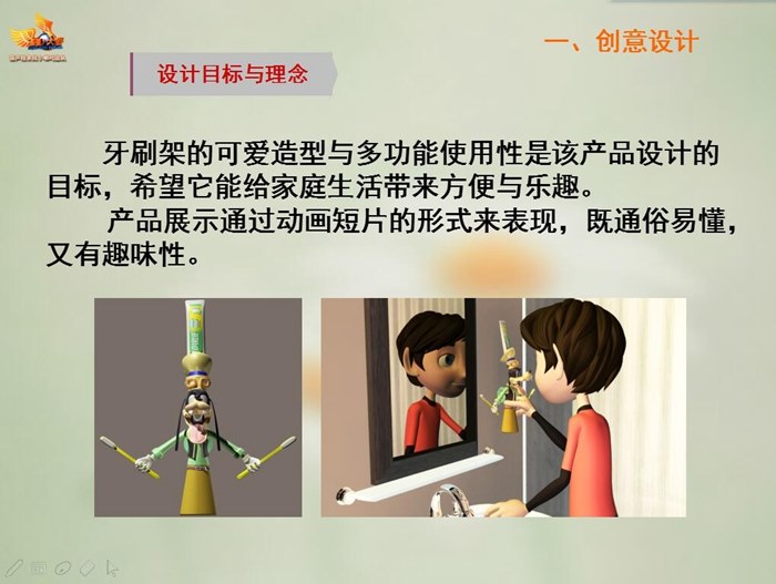 我院藝術設計係“漫(màn)人堂—葫蘆娃來戰小哪吒團隊”選手葛凱、董旭然的獲獎作品“多功能牙刷架(jià)產品設計製作與動畫展示”,是在王棟臣、韓明老師的精心指導下,曆時9個月,利用課餘時間進行市場調研、設計草圖、設計方案,製作三維模型、文字台本(běn)、角色、場景設計、分鏡(jìng)頭繪製、三維動畫製作等各環節的有序推進,以江蘇賽區特等獎的好成(chéng)績進入本次(cì)全國總決賽。決賽現場,我院是江蘇省參賽院(yuàn)校在數字表現方(fāng)向的唯一勝出者,選手作品與現場(chǎng)表現高度吻合本屆大賽“互聯網+中國製造2025—眾創、眾包、眾扶、眾籌”的主題,充分展現出我院第二課堂的建設成果、學生跨專業學習(xí)能(néng)力及創新、創造能力,受到了評(píng)委專家與(yǔ)大眾的高度讚譽。