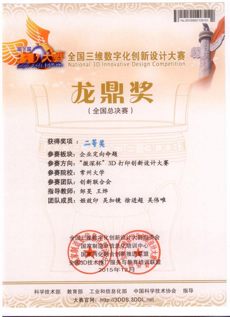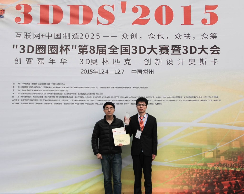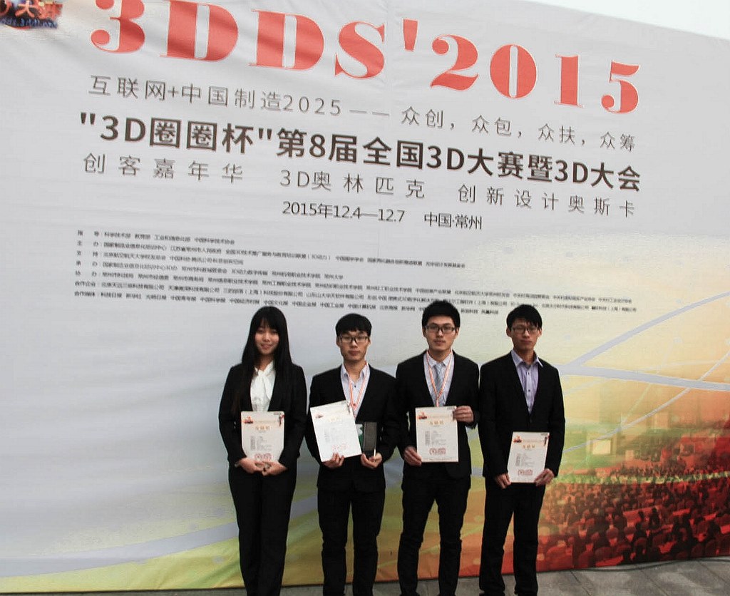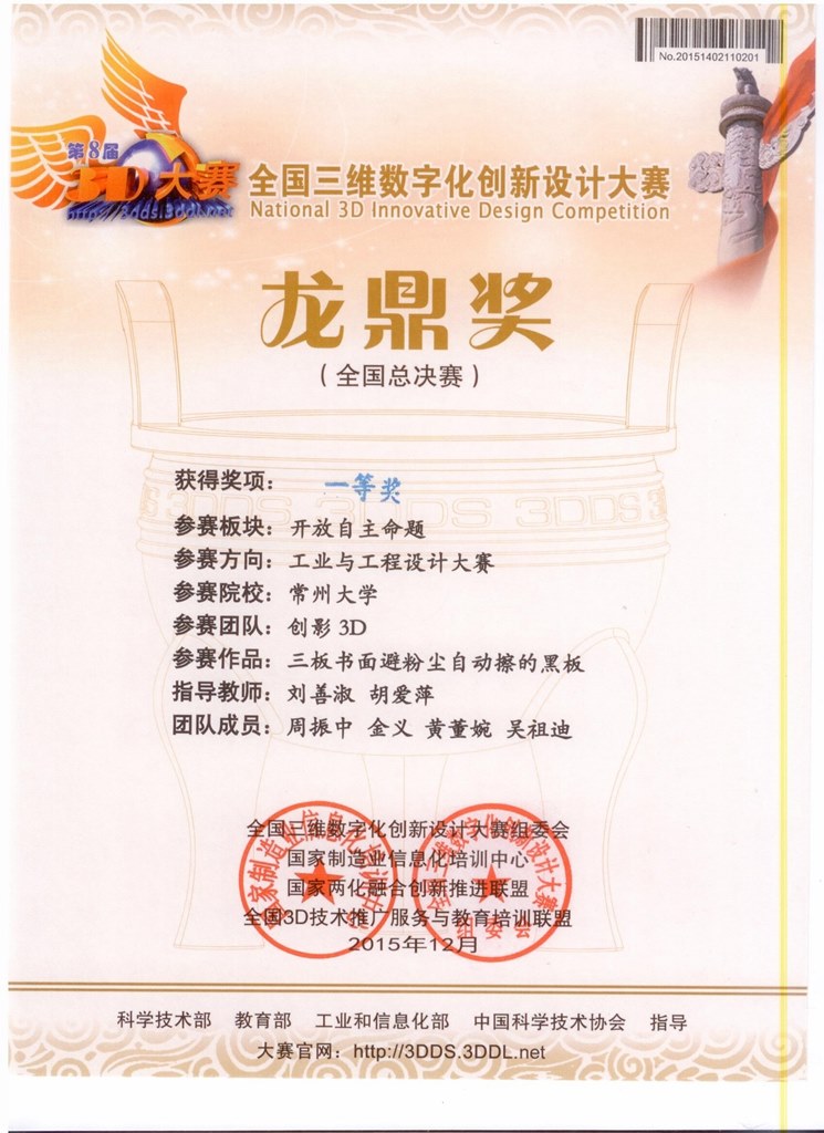 12月6日,經過初賽、決賽、再到總決賽,曆時9個月的“3D圈圈杯”第8屆全國3D大賽暨3D大會在江蘇省常州市科教城圓滿(mǎn)落(luò)幕。我校(xiào)師生在本屆大賽中表現出色,由劉善淑、胡(hú)愛萍老師(shī)指導,周振中、金義、黃董婉(wǎn)、吳祖迪等同學的作品“三板書麵避粉塵(chén)自(zì)動擦的(de)黑板(bǎn)”獲工業與工程設計(jì)項目全國(guó)一等獎(省(shěng)內僅(jǐn)有五所高校獲得一等獎(jiǎng)),由鄒旻、王燁老師指(zhǐ)導,姬效印、吳加鏡、徐進(jìn)超、吳(wú)偉唯等同學的作品“基(jī)於機械原理的滾球式綜合演示教具”和由(yóu)王燁老師指導,周振中、李(lǐ)政(zhèng)陽、吳祖迪、王仲旺等同學的作品(pǐn)“基(jī)於並(bìng)聯機構的(de)多自由度3D打印設備”分(fèn)獲3D打(dǎ)印創新設計項目、工業與工程設計項目全國二等獎。此外,機電131班(bān)周振中同學榮獲騰訊公司頒發的“科普創客·3D達人”稱號。