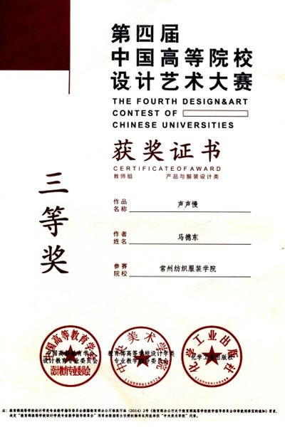 在剛剛落下帷幕的2015年第四(sì)屆中國高等院校設計藝術大賽中(zhōng),我院服裝係教師馬德(dé)東憑借其設計(jì)作品《聲聲慢》在眾多參賽作者中排名第三,獲得產品與服裝設計類教(jiāo)師組比賽(sài)三等(děng)獎(一等獎空缺),也(yě)是獲獎選手中唯一的高職院校教師。