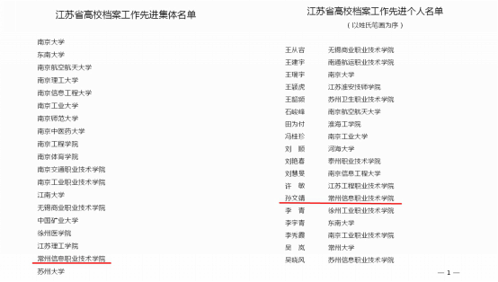 2015年12月25日,江蘇省(shěng)檔案局、江蘇省教育廳聯合發文,對在高校檔案(àn)資源體係、利用體係、安全體係建設及(jí)檔(dàng)案工(gōng)作服務學校等方麵做出顯著成績的集體和個人進行了表彰。我院被評為全(quán)省(shěng)高校檔案工作先進集體,孫文靖老師榮獲全省高校檔案工作先進個人榮譽稱號。