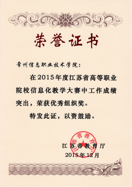 2015年江蘇(sū)省高等職業院校信息化(huà)教學大賽微課教(jiāo)學比賽評選結果(guǒ)揭曉,我(wǒ)院(yuàn)喜獲一等獎5項,二等獎2項(xiàng),三等(děng)獎2項,一等獎作品獲獎數量在(zài)參賽高職院校中榮登榜首。我院被授予優秀組織獎。