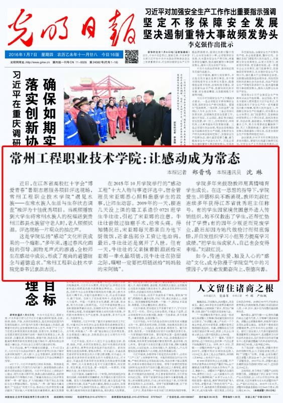 日前,《光明日報》以“常州工程職業技術(shù)學院:讓感動成為常態”為題,對學(xué)院多年來持續貫徹落實以生為本的育人理念(niàn)、師生自覺傳遞(dì)關(guān)愛和感動的校園特色文化建設工作(zuò),給予了深入報道(dào)。