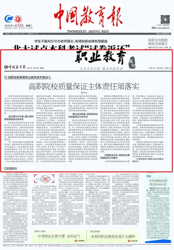 1月12日,《中國教育報》職(zhí)業教育(yù)版頭條(tiáo)位(wèi)置刊登學院黨委(wěi)袁(yuán)洪誌書記觀點文章(zhāng):《高職院校質量保證主體責(zé)任須落實》。