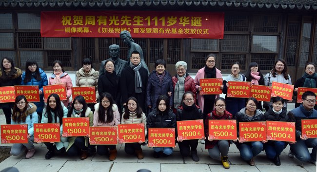 慶(qìng)祝活動中周老夫婦(fù)銅像落成揭幕,新(xīn)書《111歲如是我聞》首發和周有光獎學金(jīn)頒(bān)獎。市領導(dǎo)、周老家(jiā)屬及常州大學領導分別致辭。市領導張躍高度評價(jià)了周老先(xiān)生光輝燦爛的一生,並號召年輕人將周(zhōu)老的精神傳承下(xià)去;周(zhōu)老先生家屬對關(guān)心周老先生的社會各界人士表示感謝;陳奎慶在致辭(cí)中表示,以周有光先生的名字命(mìng)名常州大學的語言文化學院,是對周老學術思(sī)想的繼承(chéng)與弘揚,也是對周有光(guāng)語言文化學院未(wèi)來發展(zhǎn)的期許。常州大學周有光語言(yán)文化學院的全體(tǐ)師生(shēng)將堅持“開放辦(bàn)學、教授治學(xué)”,以更加解放的思(sī)想、更加(jiā)主動的精神、更加緊迫的責任感將學院的建設發展推向新(xīn)的高度。參加活動(dòng)的領導共同為我校首批獲得周有光獎學金的周(zhōu)有光語言文化學院(yuàn)的20名同學頒獎。