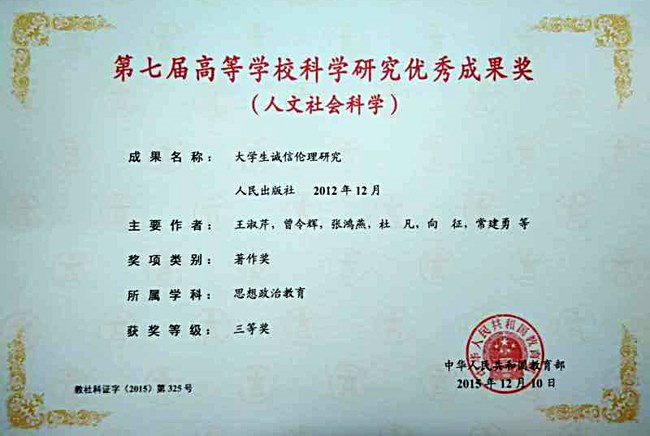 日前,教育部正式公布了第七屆高等學校科學研究優秀成果獎(人文社會科學)獲獎成果(guǒ)名單(dān)。我校特聘教授王淑芹的著作《大(dà)學生誠信倫(lún)理研究》、我校芮國強研究(jiū)員參(cān)著(排名第二)的著作(zuò)《地方(fāng)政府改革與深(shēn)化行政管理體製改革研究》分別榮獲著作獎(jiǎng)三等獎。