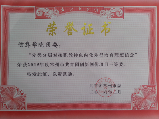 日前共青團常州市委發文對 2015年度全市共青團相關工作進行表彰。學(xué)院團委獲得“2015年度常州市優秀團委”榮譽(yù)稱號,院團委申報的“分類分層對(duì)接職教特色內化外行培育理想信念”項目榮獲2015年度常州市共青團創(chuàng)新創優項目三等獎。
